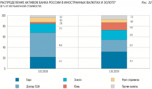 - О том, что весной 2018 года, после американских санкций, ЦБ перевел пятую часть своих международных резервов из долларов в евро и юани, стало известно еще в январе. Теперь выяснилось, что всего за год регулятор вдвое снизил долю своих активов в долларах (с 45,8 до 22,7% от рыночной стоимости), резко нарастив долю активов в юанях и евро.