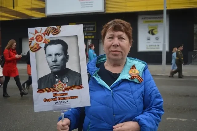 Замечаю пожилую женщину, идущую по улице с портретом коренастого крепко сбитого мужчины. Имя на плакате: Шевнин Сергей Потапович.