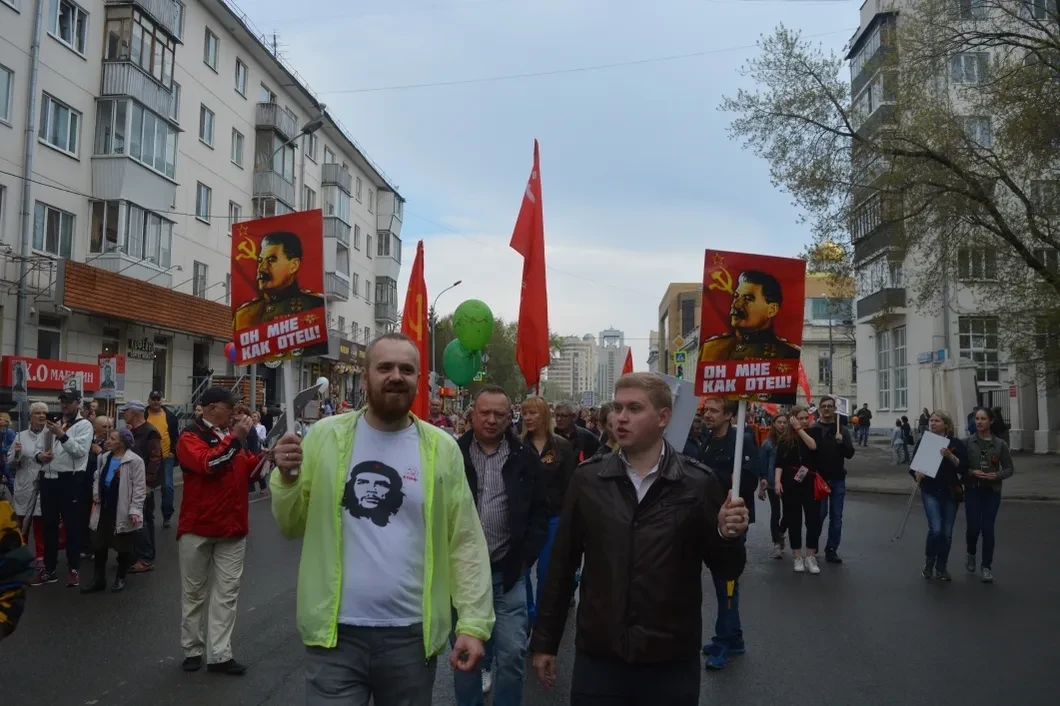 За полчаса до начала шествия в колонну вливается группа человек из двадцати с красными флагами и портретами Сталина. В ее главе оказываются депутат гордумы Екатеринбурга Роман Ступников и первый секретарь областного комсомола Денис Курочкин.