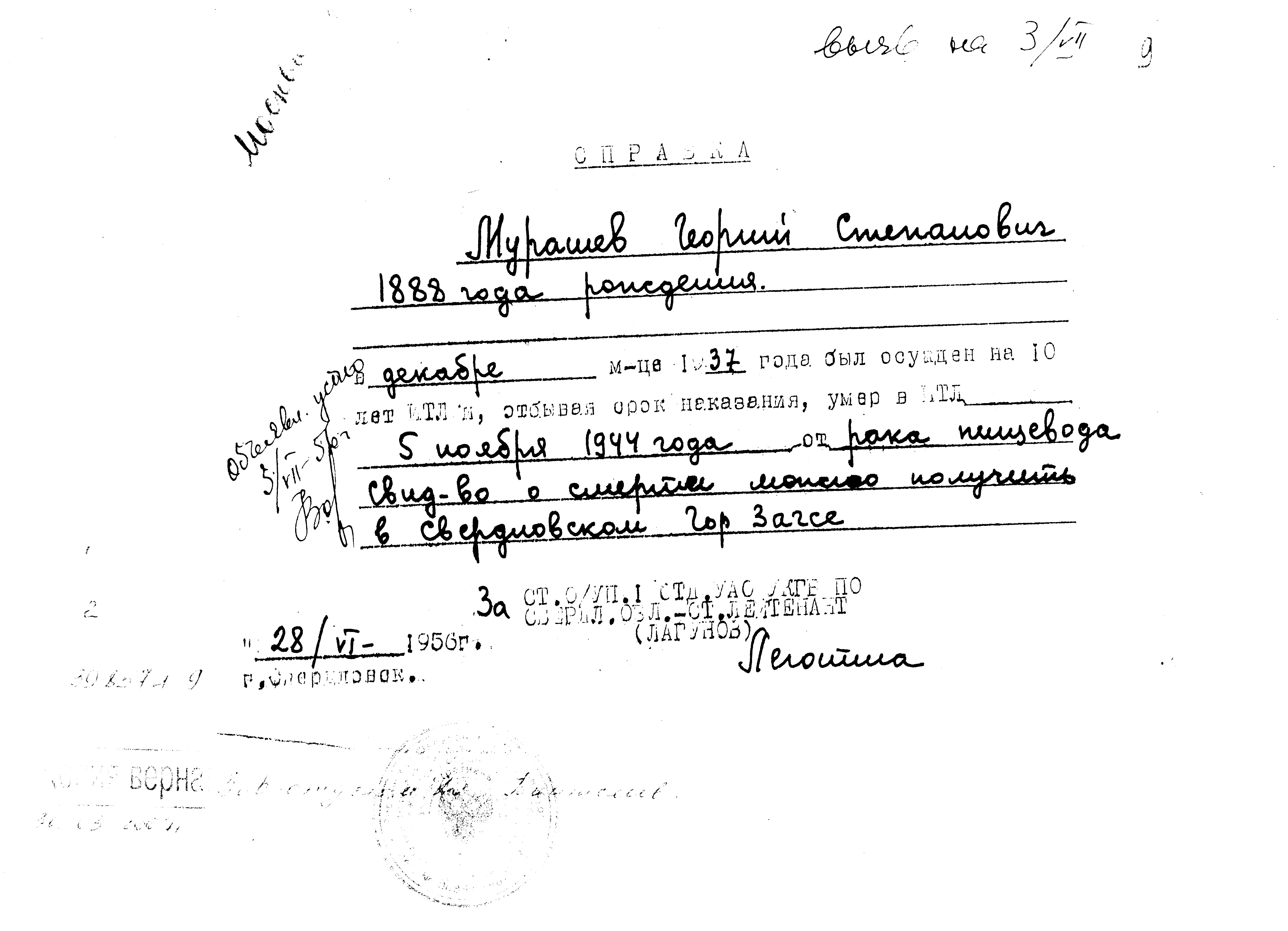 По документам, добытым Валерией Викторовной в архиве, дело по обвинению ее дедушки, Георгия Степановича Мурашева, было рассмотрено 5 декабря 1937 года на заседании тройки при УНКВД Свердловской области. Георгия Мурашева обвинили в участии в офицерско-повстанческой организации и подготовке вооруженного восстания с целью свержения советской власти. 13 декабря 1937 года он был расстрелян.
