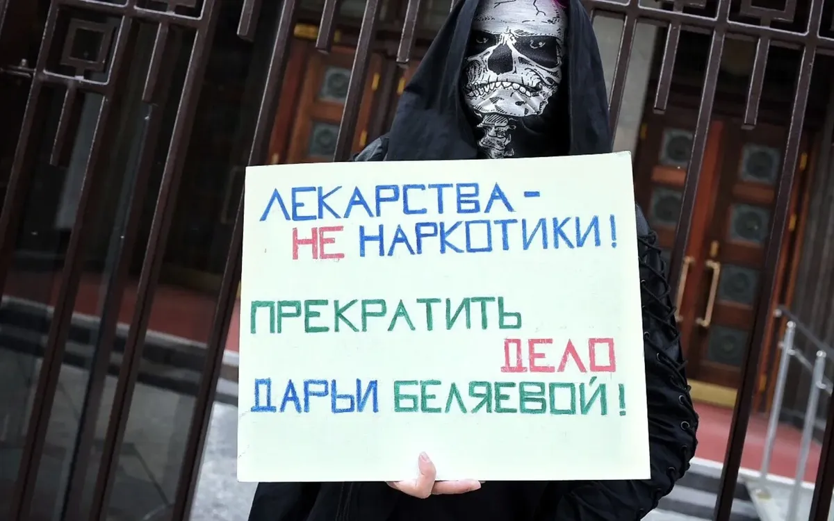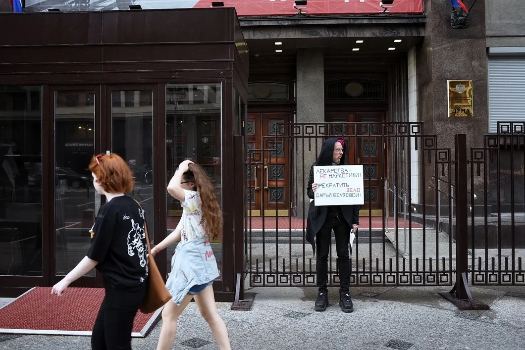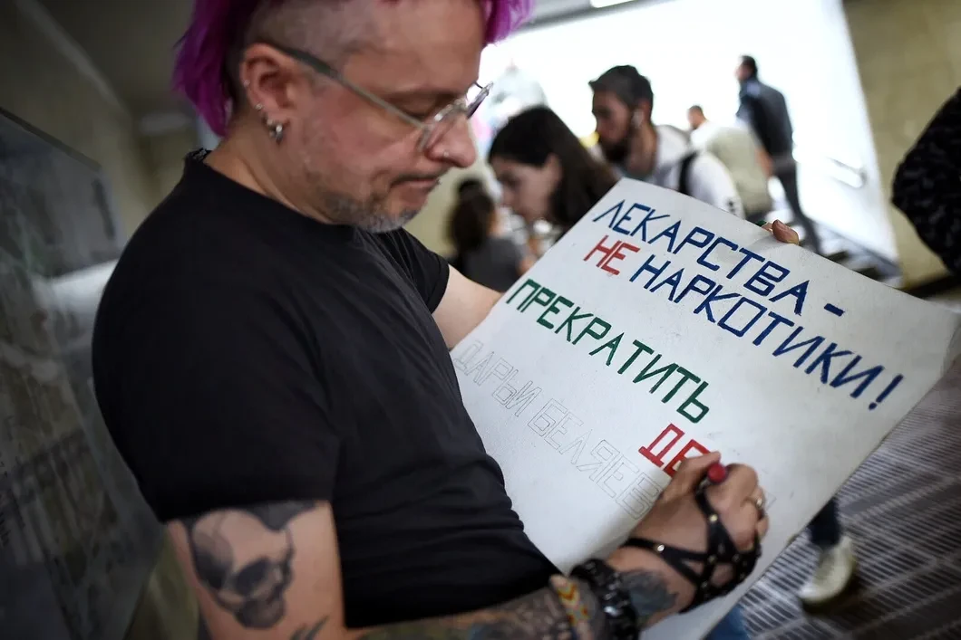 Александр Дельфинов — журналист, поэт и активист — стоит у выхода из метро «Охотный ряд» и раскрашивает цветными фломастерами плакат: «Лекарства — не наркотики! Прекратить дело Дарьи Беляевой!» Одиночный пикет возле Госдумы должен начаться в 3 часа дня, но накрапывающий дождь грозит нарушить планы.