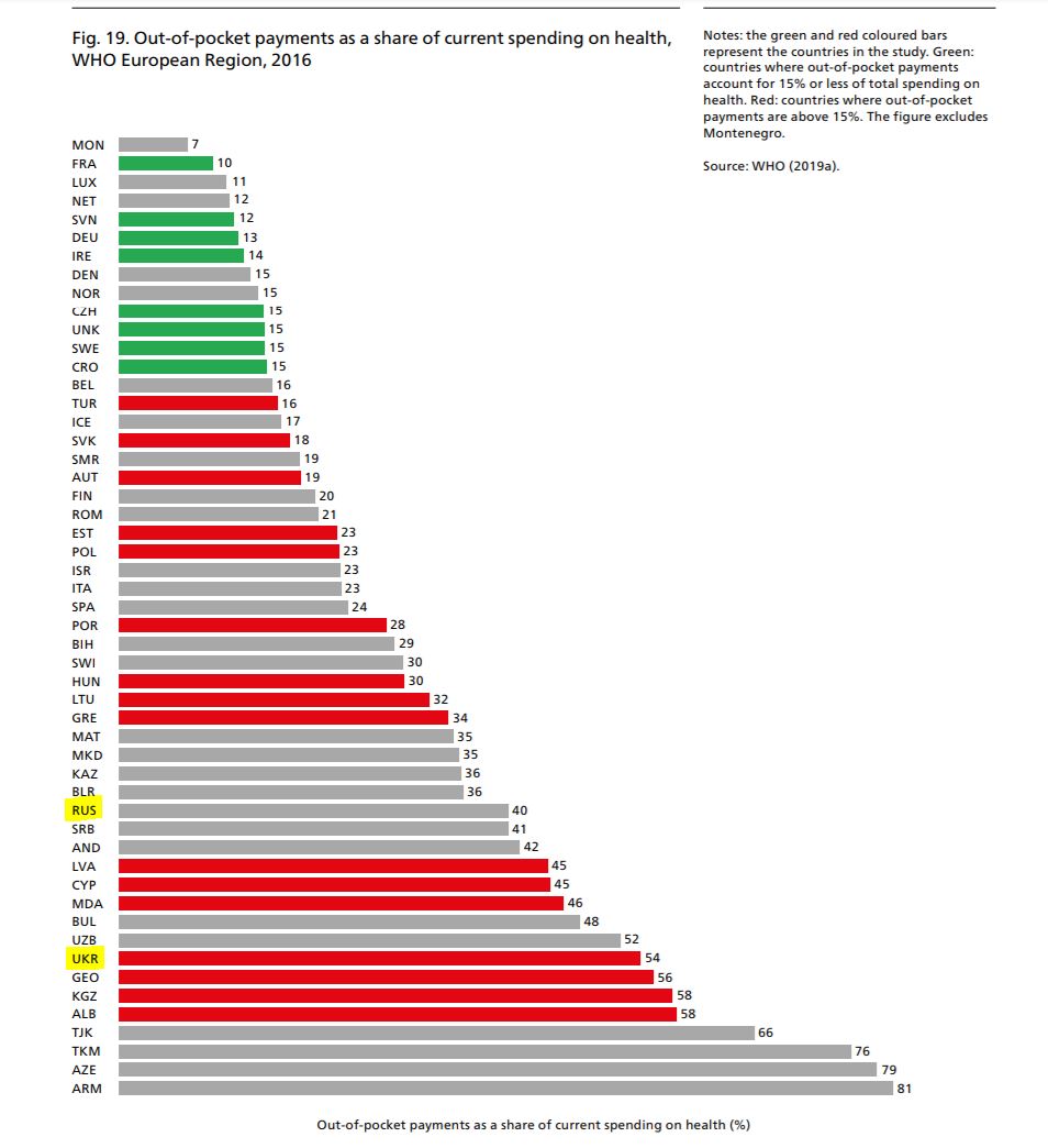 Тем не менее, по данным ВОЗ, за «бесплатную» медицину из своего кармана доплачивают жители обеих стран. На эти средства приходится 40% стоимости всех медуслуг в России и 54% на Украине. Речь и о платной медицине, и о взятках. Из пациентов, госпитализированных на Украине в 2015 году (более поздних данных нет), 37% платили «неформальные взносы», как аккуратно называет их ВОЗ в отчете за 2018 год. Причем больше половины этих «взносов» платились по инициативе медперсонала, а не пациентов.