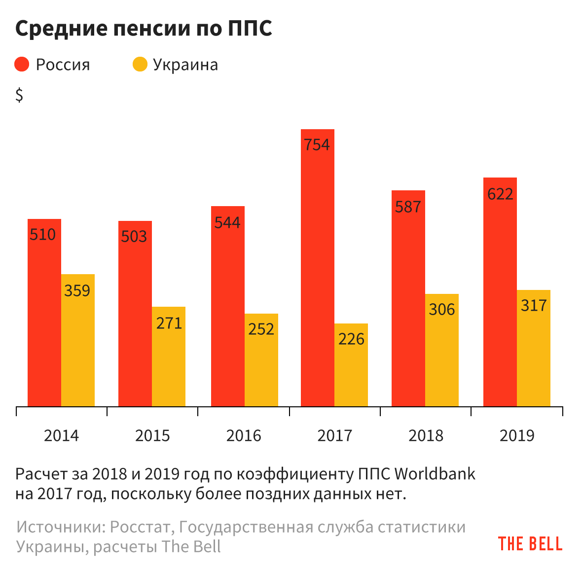 С 2019 года на Украине пенсии начнут индексировать по новой формуле: ежегодная прибавка составит 50% от роста инфляции и 50% от роста средней зарплаты — это было предвыборной акцией Петра Порошенко. Вот очень приблизительный подсчет: инфляция по итогам прошедшего года (с апреля 2018 по апрель 2019) составила 8,8%. Средняя зарплата в 2018 году была выше, чем в 2017, на 4,4%. Выходит, что ежемесячная пенсия по новой схеме должна вырасти примерно на $20. В России ПФР обещает индексировать пенсию на 7,05% — то есть в среднем на $42 в месяц. Это сохраняет соотношение прежним.