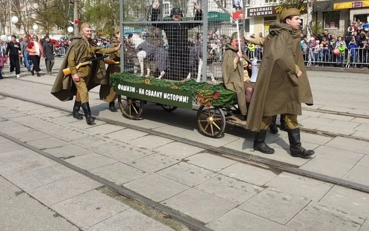 9 мая Нижний Тагил оказался в центре скандала из-за праздничной демонстрации, в ходе которой по городу провезли клетку с находящимся внутри «фашистом». На клетке было написано: «Фашизм — на свалку истории». Вместе с человеком в клетке ехала собака — немецкий боксер.