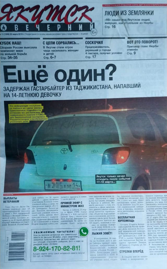 Как сообщает «Медиазона», в марте в печатной версии газеты вышел материал «Еще один? Задержан гастарбайтер из Таджикистана, напавший на 14-летнюю девочку». Статья появилась на первой полосе через несколько дней после того, как в Якутии прошли антимигрантские митинги.