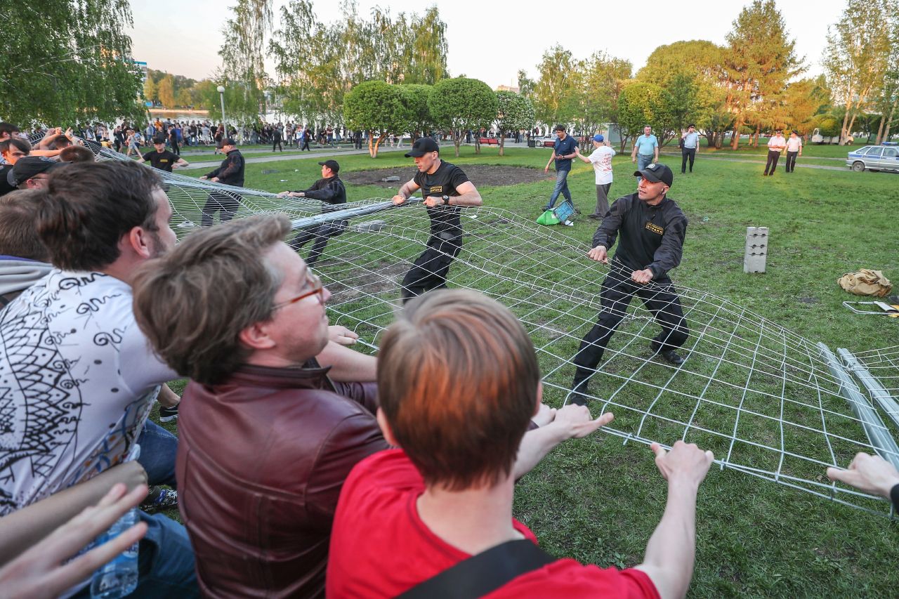 После возвращения забора в вертикальное положение часть протестующих остается внутри периметра, и в этот момент обстановка — самая нервная, готовая перейти в драку. Люди с одной стороны требуют выпустить своих знакомых из-за оцепления и скандируют «Позор!» «Сторонники строительства» грубо и агрессивно отвечают, дело идет к драке. Бывший главный редактор крупнейшего екатеринбургского портала Е1 (а теперь директор всей сети городских порталов медиахолдинга «Херст Шкулев») Ринат Низамов кричит, что сейчас позвонит главе РМК Игорю Алтушкину и его жене — и главе компании придется «лично извиняться за вас, кабанов». И хотя спортсмены не стесняются применять физическую силу, оставшихся на их территории они не держат.