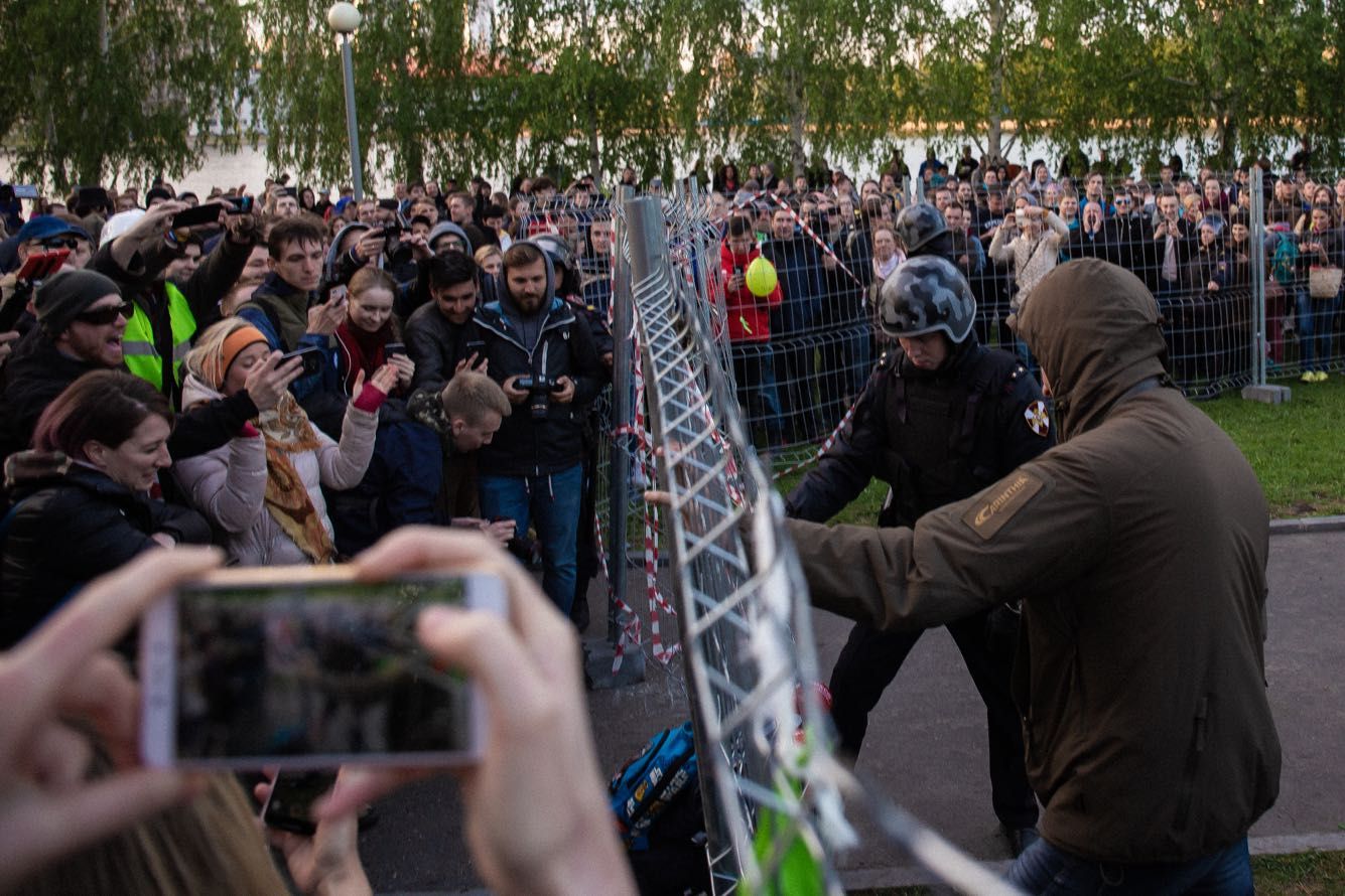 На новую акцию пришли до двух тысяч человек. Митингующие почти сразу повалили забор, которым обнесено место будущей стройки, и бросили его часть в близлежащий пруд. Место строительства кольцом окружили сотрудники охраны, к скверу стянули ОМОН и бойцов Росгвардии. Также на акции вновь появились молодые люди спортивного телосложения; они начали вступать в стычки с протестующими.