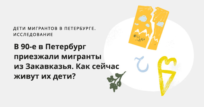 В 1990-е годы в Россию массово приезжали мигранты из бывших союзных республик — в первую очередь Грузии, Армении и Азербайджана. Отдел исследований «Бумаги» изучил, как складывается жизнь детей мигрантов в Петербурге. Для этого социолог Серафима Бутакова провела глубинные интервью с 16 молодыми людьми, чьи родители приехали из стран Закавказья.