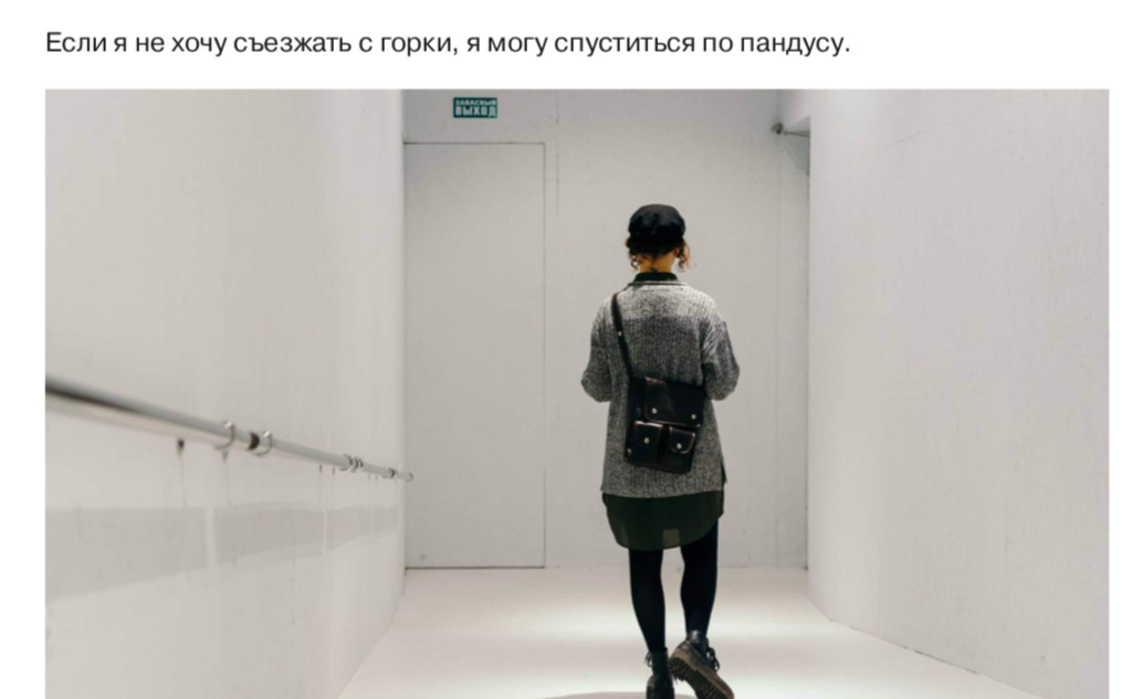 «Я считаю, что планшеты с переводом на русский жестовый язык и тактильные модели – это необходимый минимум. Это позволяет посетителям с инвалидностью и без выстроить диалог о разных модусах восприятия. Например, наличие тактильной модели внутри экспозиции заставляет людей задуматься, насколько сильно наше чувственное восприятие искусства связано с визуальными, а не с тактильными образами. А наличие перевода на РЖЯ помогает обратить внимание слышащих на тот факт, что на территории РФ есть еще один язык». Мария Сарычева