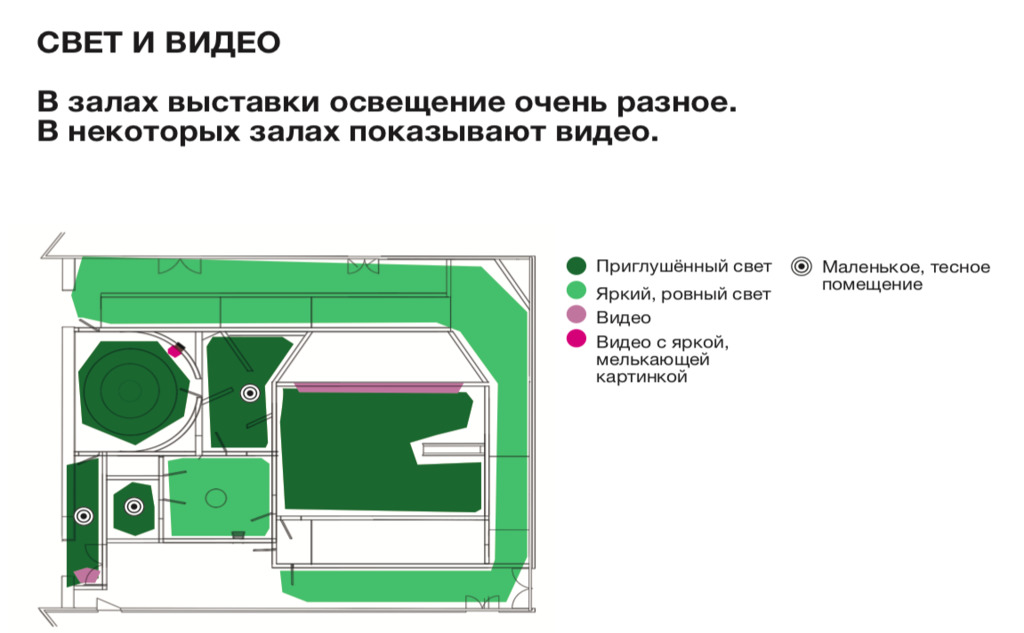 Также была подготовлена карта сенсорной нагрузки. В этом документе отмечены зоны в основной экспозиции музея и на выставке, которые могут вызвать у посетителей беспокойство из-за громких звуков, яркого света или большого количества людей.