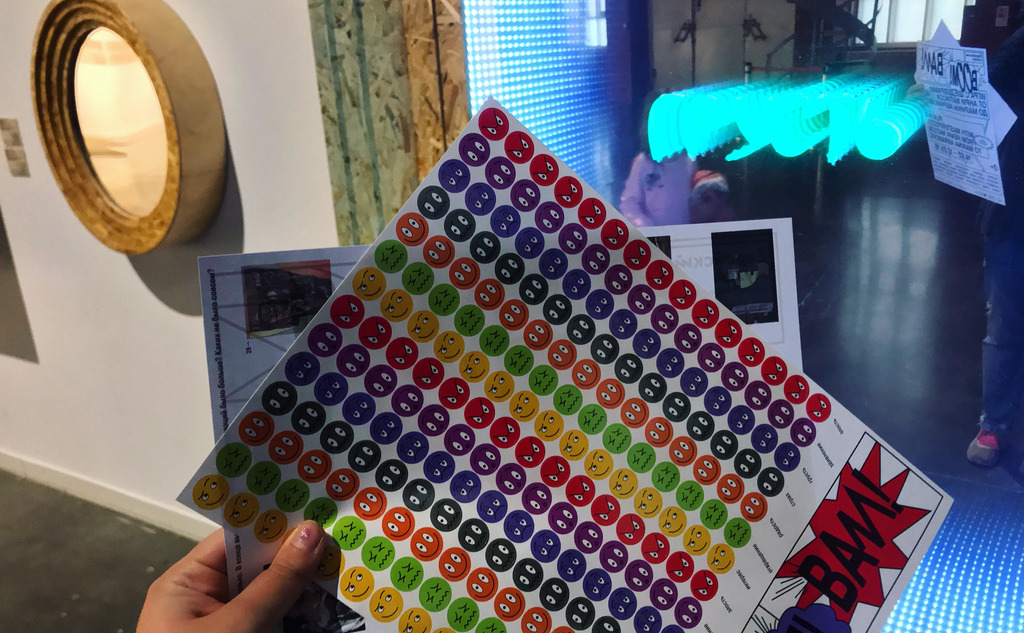 Организаторы предлагают подумать, какие эмоции вы испытываете, глядя на экспонаты, и наклеить соответствующий знак на распечатку с картинами. Определиться с отношением к картине или другому объекту иногда не очень просто. Например, фильм режиссера Герца Франка «На 10 минут старше» вызывает у меня страх. А «Картина с вертикалями» Бриджит Райли оставляет равнодушной. Но наклейки с эмоцией безразличия в наборе нет. Поэтому я решаю просто пропустить ее.