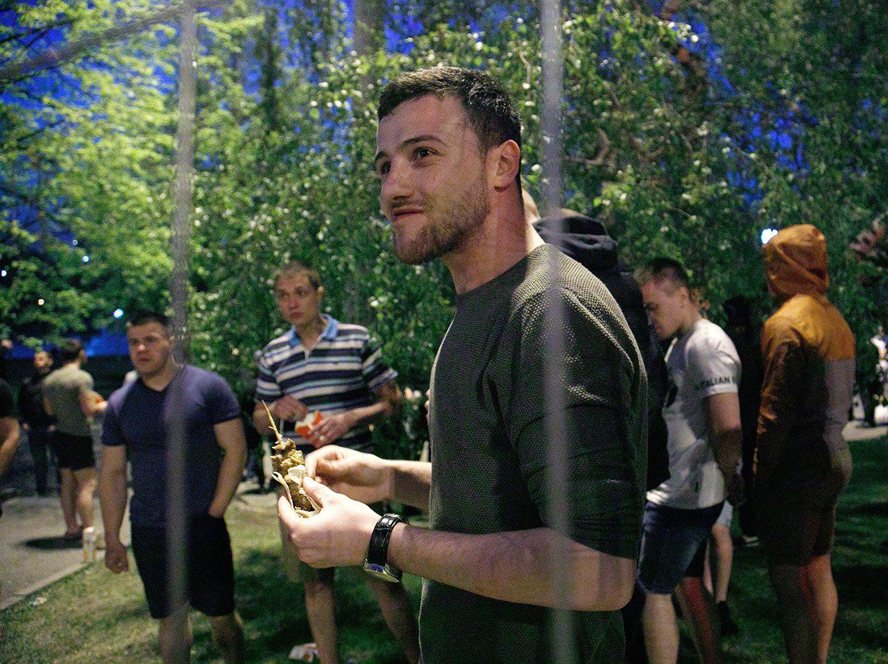 Several minutes later, Ivan Shtyrkov had joined a group of other muscular young men. They stood in a long line and walked toward the protesters. Once they managed to put the fencing protesters had knocked down back into place, some of the men stood guard over the planned construction site until dawn.