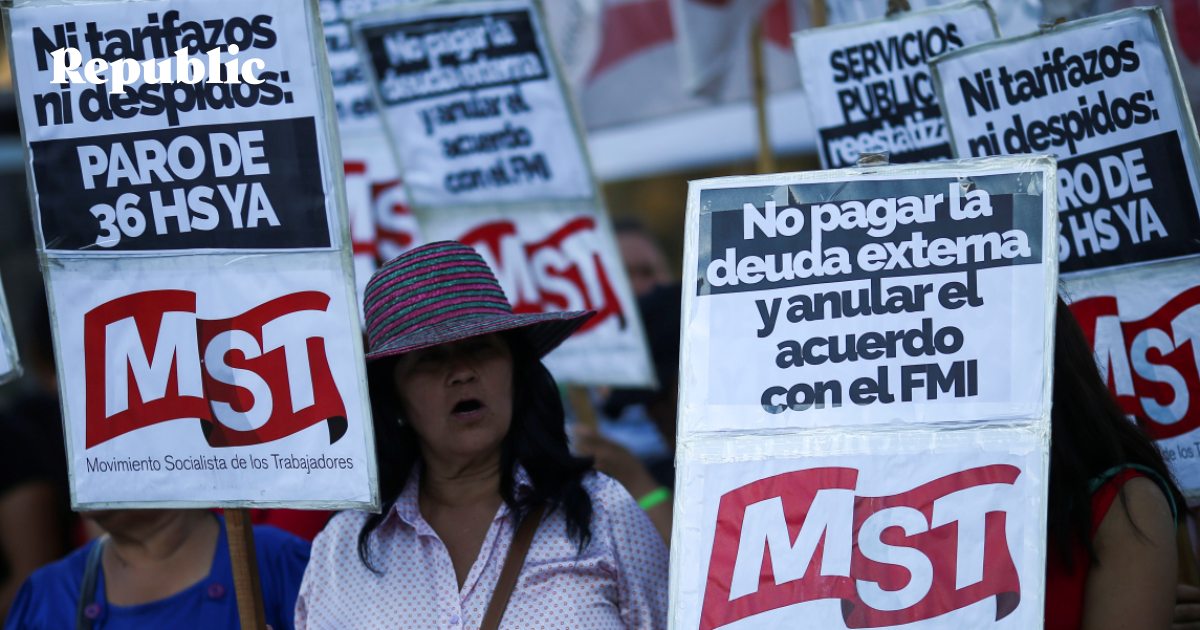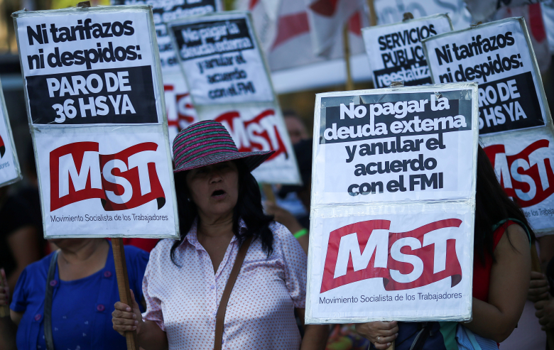 Женщина с плакатами «Нет выплатам иностранному долгу» и «Отменить соглашение с МВФ» во время протеста в Буэнос-Айресе. Фото: Agustin Marcarian / Reuters