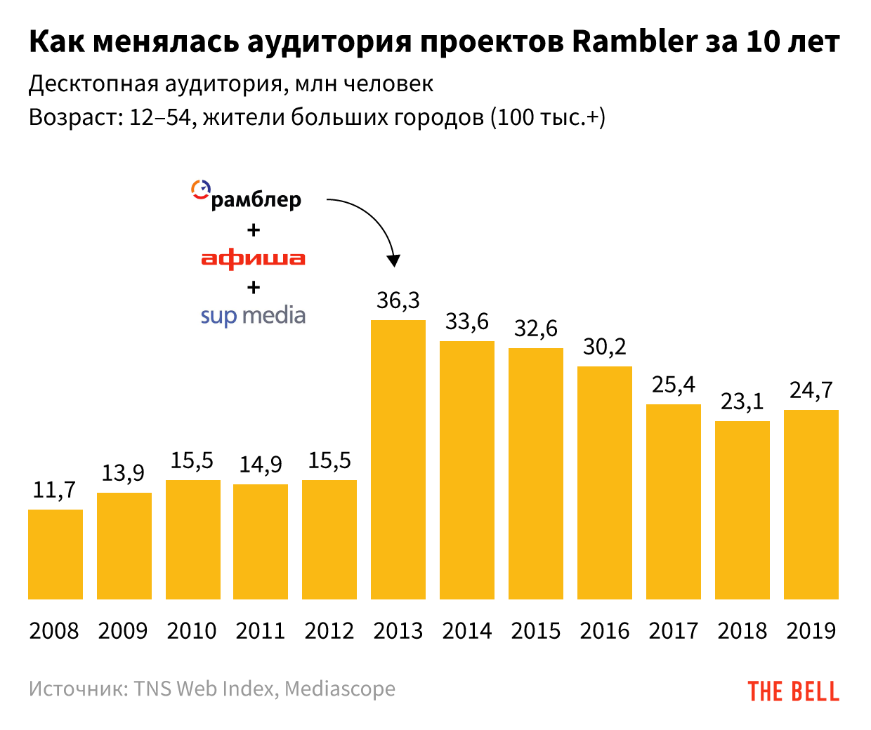 Смысл сделки был в объединении разношерстных медиаактивов. У «Профмедиа» Потанина на тот момент были издательские дома «Афиша», «Комсомольская правда», телеканалы «2x2» и «ТВ-3». Капитализация Rambler, составлявшая $440 млн, после присоединения к «Профмедиа» выросла почти вдвое. Но доля пользователей одновременно снизилась с 19% до 16,8%. Когда компания пообещала перезапустить поиск и сделать редизайн, аналитики по интернет-рынку комментировали — неплохо, что у Rambler вообще появилась стратегия.