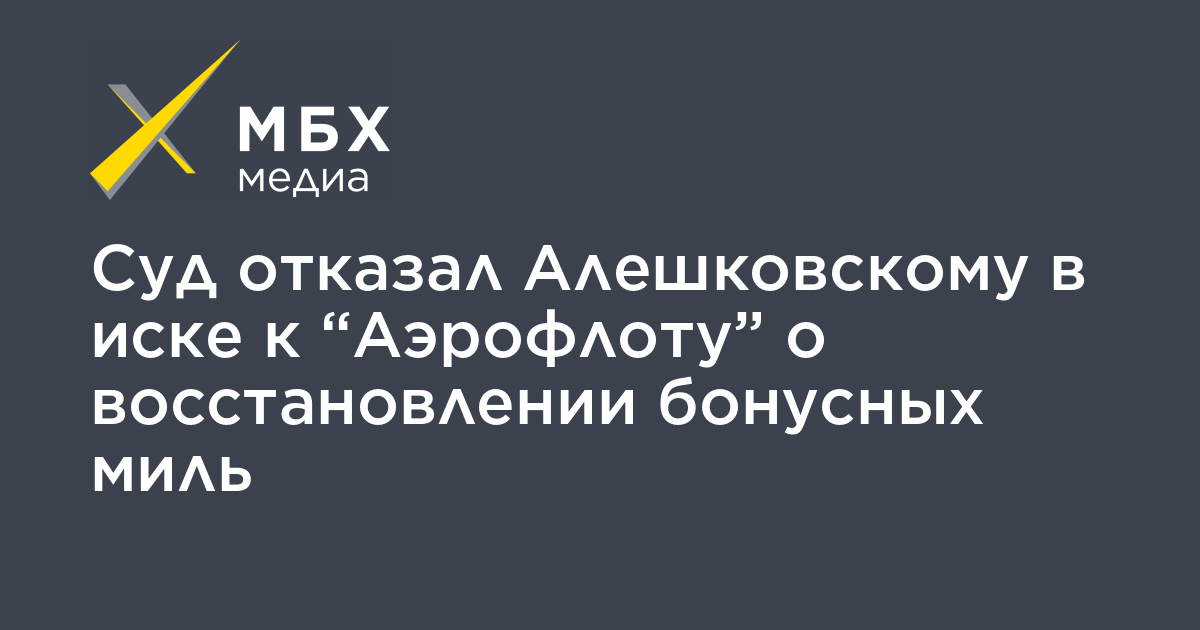 Пресненский районный суд Москвы отказал председателю совета благотворительного фонда «Нужна помощь» и директора портала «Такие дела» Мите Алешковскому в иске к авиакомпании «Аэрофлот» с требованием восстановить статусы его бонусных карт. Об этом сообщает корреспондент «МБХ медиа» из зала суда.