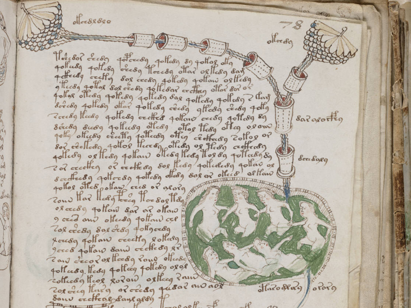 Например, на 77-й странице рукописи нарисована труба, из которой вылетает что-то вроде красного облачка. Джерард Чешир читает надпись рядом с трубой как omor néna и переводит: «мертвый ребенок», полагая, что рисунок изображает выкидыш или искусственный аборт. Слово omor он нашел в румынском, где оно значит «убивать», второе слово – в испанском niña «девочка». Особенную пикантность этой расшифровке добавляет тот факт, что румынское слово omor – славянское заимствование (из уморити), которое никак не могло употребляться в языке Неаполитанского королевства XV века.