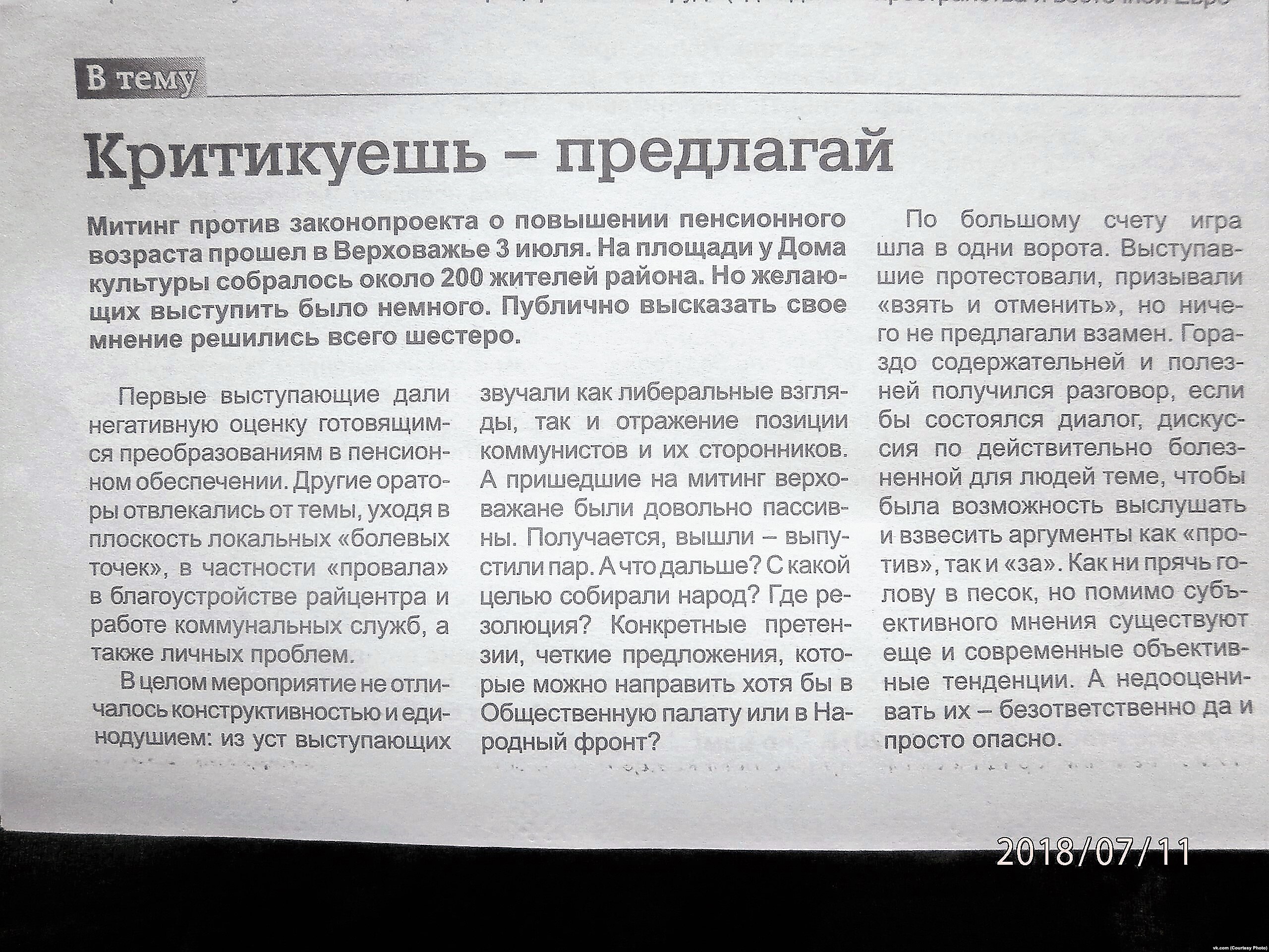 – В ней было написано, что народ [на митинге] был пассивен, что никому не было интересно, что пришло мало народа, что никаких предложений не было, что все это пустые слова и никому это не надо. Хотя на самом деле собралось триста человек, чего в Верховажье никогда не было, аплодировали словам "Путин – вор", поддерживали меня. Это вообще был первый такой митинг в Верховажье, не считая всех этих первомайских и им подобных.