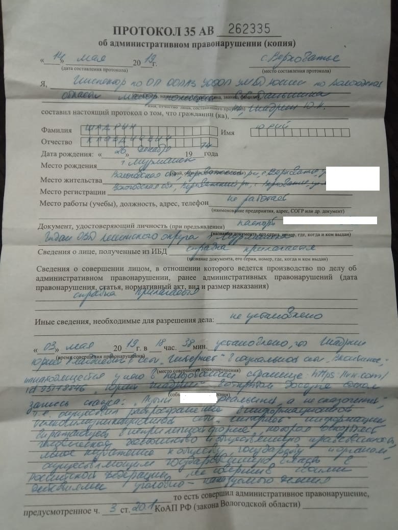 "Для рассмотрения такого важного дела приехала целый майор какого-то там отдела по Вологодской области. Ну как же, такое преступление! Тут силами одной местной полиции не справиться. В протоколе она написала, что я совершил уголовно наказуемое деяние, поэтому на меня заводится административное дело по ч. 3 ст. 20.1 КоАП РФ. Женская логика, не иначе", – написал Юрий на своей странице в соцсети.