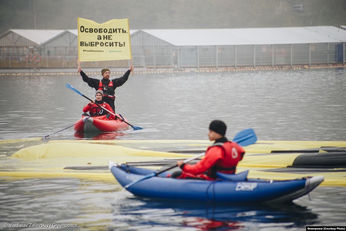 Активисты Гринпис России потребовали провести реадаптацию косаток и белух, которых содержат в так называемой "китовой тюрьме" в Приморье, и выпустить животных в месте отлова. Экологи на надувных лодках и каяках развернули в 150 метрах от вольеров баннеры "Освободить, а не выбросить" и "Нет китовым тюрьмам", а также тридцатиметровый плакат "СВОБОДУ КИТАМ".