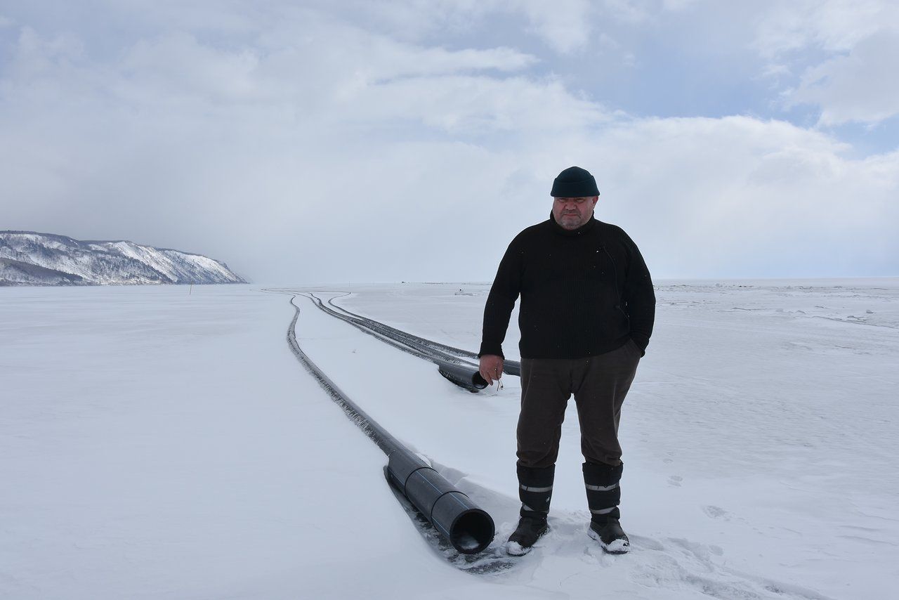 Markulis and Naida walk along Baikal’s ice, passing a trench that threads pipelines into the lake to draw water. At the shore, the pipes are supposed to be buried in the sand, emerging only underwater. The plan was to pump at a depth of 400 meters (a quarter of a mile), 2.5 kilometers (1.6 miles) from the coastline. These are the same pipes that “painfully wound Father Baikal,” according to Victoria Bonya.