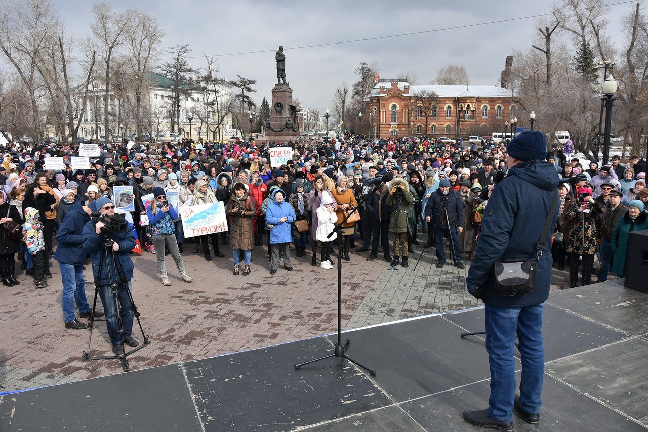 On March 24, activists assembled for a rally at a public park in Irkutsk in support of Lake Baikal. The demonstration was supposedly apolitical, but it included a speech by the city’s mayor, United Russia member Dmitry Berdnikov, who declared that the people of Irkutsk are Baikal’s greatest defenders. The event also featured a performance by a Buryat dance ensemble, the crowd sang songs about the lake, and after two hours everyone lined up in the shape of a heart for an aerial drone photo.