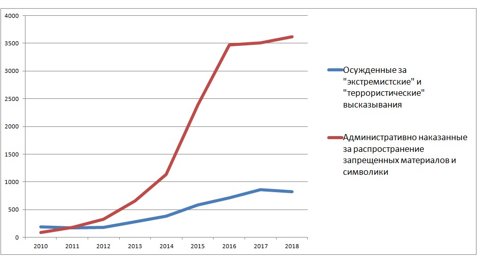 Еще одно направление антиэкстремистской политики, на которое очень важно обратить внимание, – это применение административных мер. Политический смысл их применения Кремль видит иначе, чем уголовных. Административные дела скорее направлены на профилактику, чем на репрессии. Их адресат – гораздо более широкая целевая группа, не только по сравнению с делами запрещенных или подпольных групп, но и по сравнению с антиэкстремистскими же уголовными репрессиями. График ниже показывает динамику правоприменения по двум основным антиэкстремистским статьям КоАП в сравнении с уголовным преследованием за «экстремистские» и «террористические» высказывания.