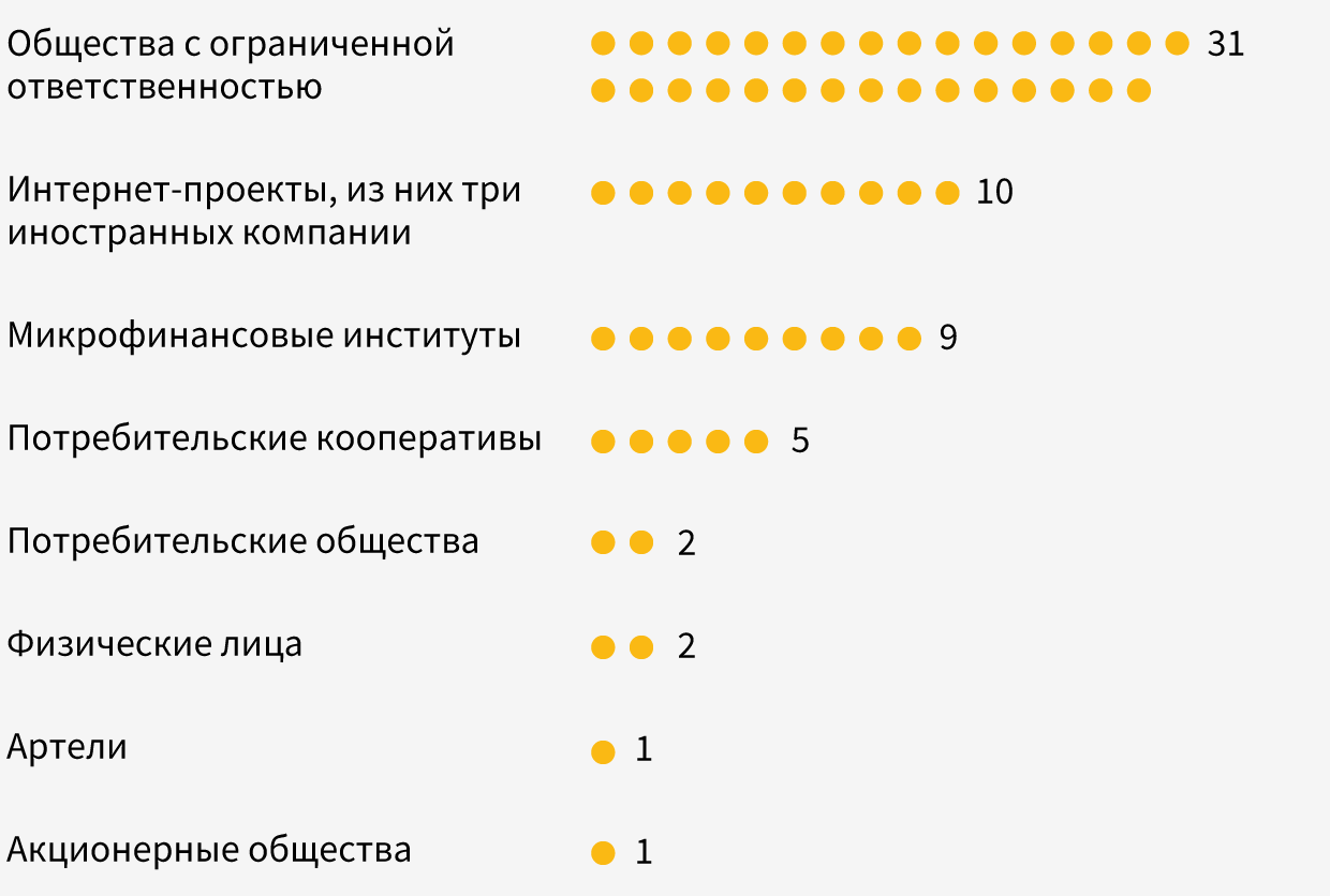 созданных в 2018 году, 72 регистрировались как ООО, 63 работали под вывеской кредитных и потребкооперативов, остальные в иных формах