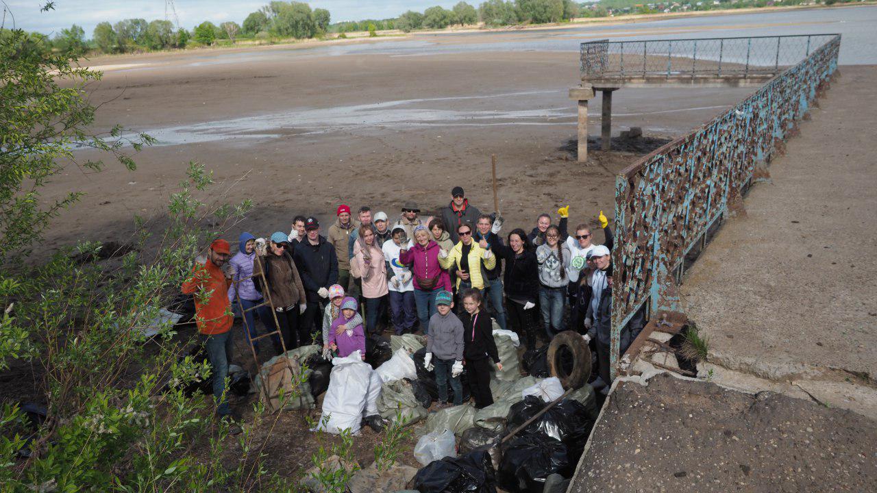 На субботник вышли несколько десятков человек. Уборка началась в полдень и еще не закончилась. Порядок наводили на нескольких площадках. Больше всего работы предстояло проделать у причала на Казанке: вода ушла, и обнажилось дно с горами мусора: пластиковыми и стеклянными бутылками, покрышками и прочим мусором.