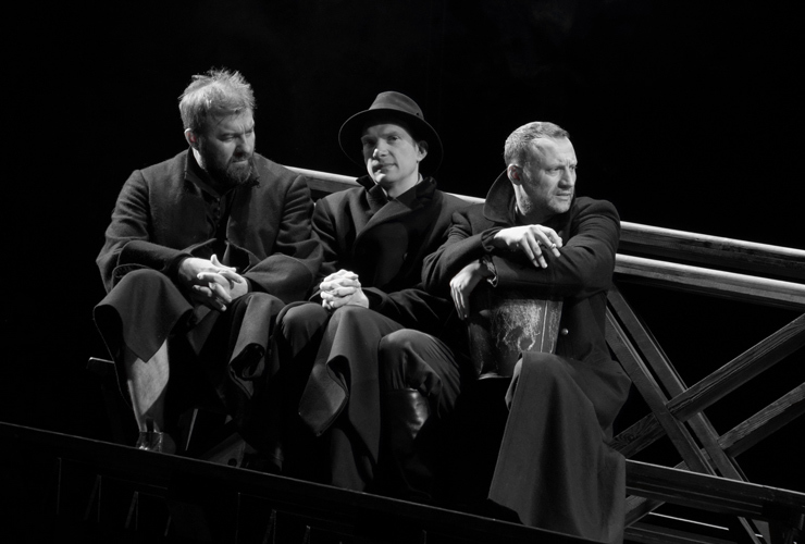 К тому же во тьме видно не слишком хорошо. Россия во мгле… Очень красивая декорация Александра Боровского рождает сцена за сценой все новые и новые образы. То кажется, что это вагоны, дребезжа и поскрипывая на перегонах и остановках, несут Белую армию к финалу. То вдруг платформы, сдвинувшись, превращаются в корабельную палубу, гибельно накренившуюся в бурных волнах истории, — или в крутые улицы стамбульской Галаты, приютившей русских беженцев. Порой платформы Боровского напоминают разводные мосты Петрограда с телеграфными столбами…