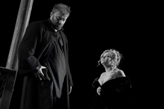 Здесь брег совсем не светлый. Мрачный. Все пространство сцены — во тьме. Тьма накрыла его, как «ненавидимый прокуратором город». Из нее и выплывает Голгофа мрачного генерала Хлудова. Русская Голгофа. Хлудов Анатолия Белого не уходит с этого помоста почти ни на миг. Он почему-то оказывается даже в Париже во время карнавального бесштанного безумия Чарноты у Корзухина. Его речи похожи на невнятное бормотание королевы Маб: бесконечные, они расширены за счет других произведений Булгакова. Если же учесть, что едва ли не впервые за последние лет десять актеры МХТ играют без микрофонов, при этом все время находясь в середине огромной распахнутой, будто наизнанку вывернутой во всю ширь сцены, то станет ясно, отчего их речь похожа на невнятные сонные бормотания. Порой слышатся крики темпераментного и брутального Чарноты — Михаила Пореченкова, порой взлетает над сонной тьмой чуть осипший голос его подружки Люськи — Ирины Пеговой. Но все остальное нечасто долетает до середины партера.
