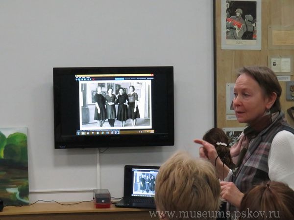 Заведующая отделом редких и рукописных книг Светлана Волкова представила девять любительских снимков, где запечатлены сотрудники Псковского музея периода 1948-1950-х гг. На снимках - А. Пурышев, К. Акасинова, Е. Иванова, Е. Пронь, Е. Орлова, Г. Серова, А. Васильева и др. во дворе музея, в кабинетах, на праздничной демонстрации и др.