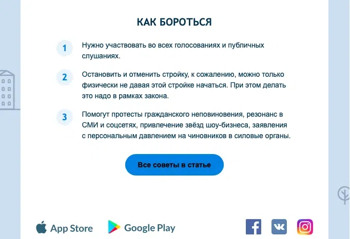 Авторы рекомендаций посоветовали участвовать в публичных слушаниях и голосованиях. Также они сообщают, что в выступлениях против застройки «помогут протесты гражданского неповиновения, резонанс в СМИ и соцсетях». В письме отмечается, что остановить строительство на месте скверов «можно только физически, не давая этой стройке начаться», а бороться с застройкой нужно в рамках закона.