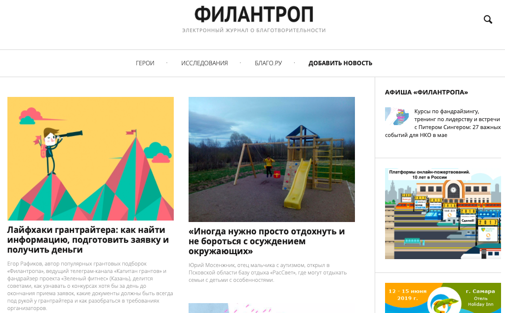 Ежедневно журналисты Филантропа публикуют материалы на тему благотворительности: лайфхаки, советы экспертов, истории сотрудников и руководителей НКО. А еще команда журнала регулярно запускает интересные спецпроекты. Например, о том, как НКО и бизнесу найти общий язык. У проекта также есть ежедневная рассылка с анонсами событий в некоммерческой сфере, на которую можно подписаться.
