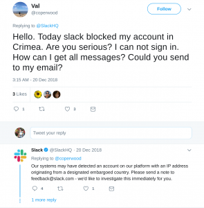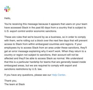 С чего все началось. В декабре 2018 года Slack начал блокировать доступ отдельных пользователей с подсанкционных территорий. Как стало известно из возмущенных постов в Twitter, под деактивацию попали те, кто пытался подключиться к месенджеру из Крыма, а также с территории Ирана, Северной Кореи и Сирии.