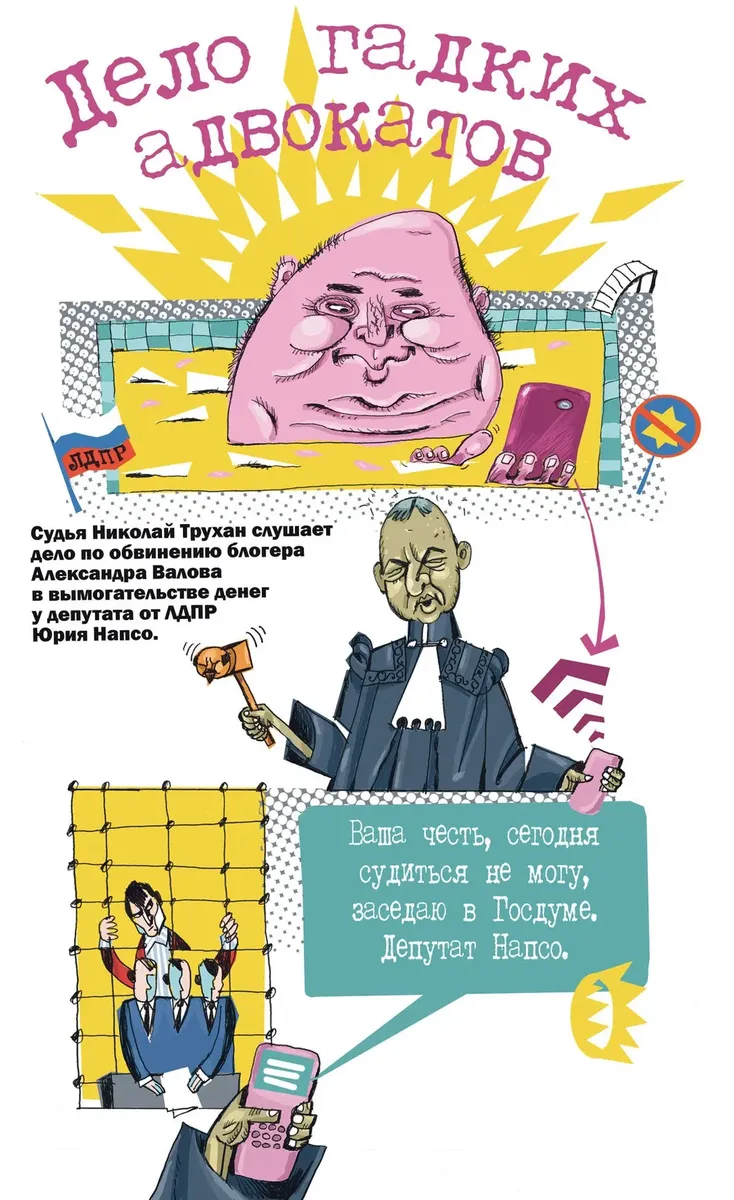 В декабре 2018 года Лазаревский районный суд Сочи приговорил блогера Александра Валова к 6 годам колонии. Валова признали виновным в вымогательстве денег у депутата Госдумы от ЛДПР Юрия Напсо. Дело завели вскоре после того, как Валов написал, что у Напсо есть собственный бассейн на территории общественного пляжа. Блогер считает дело заказным. Документальных подтверждений вымогательства потерпевший депутат следствию не предоставил. Но судью Николая Трухана это не смутило. В ходе процесса его больше интересовало, зачем подсудимый и его адвокаты задают так много вопросов потерпевшему и не является ли подсудимый евреем по национальности. «Вы еврей или кто?» — так и спрашивал судья и удалял адвокатов из процесса за возражения…