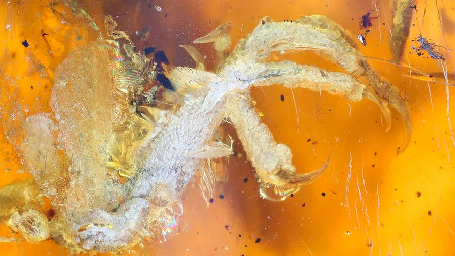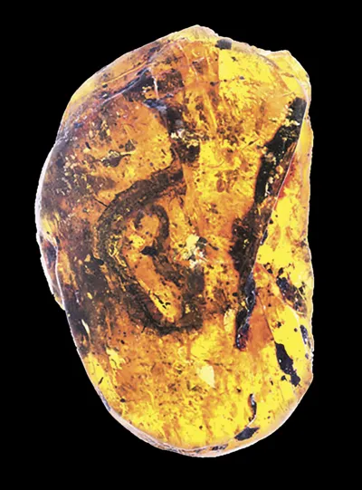 В янтаре находят и рептилий. Останки скелета древнейшего 99-миллионолетнего змееныша (вместе с фрагментами растений) впервые были описаны год назад [4].