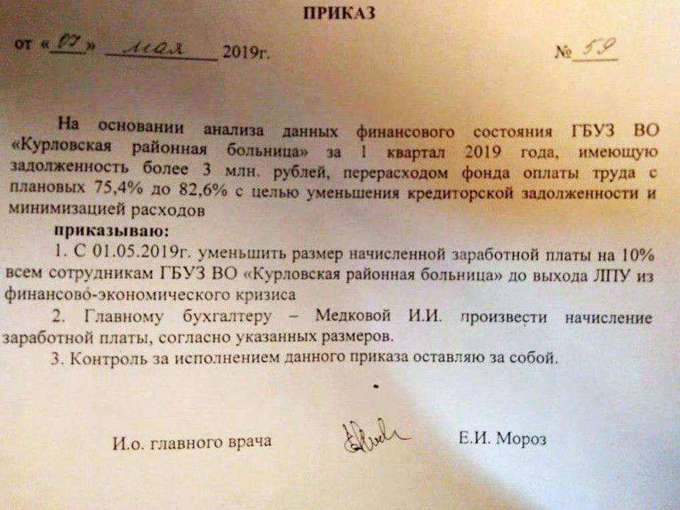 Судя по размещенной в городском сообществе фотокопии приказа, зарплату в Курлово решили еще сократить. Больница в Гусь-Хрустальном районе, а также ФАПы в приписанных к ней селах вынуждены сокращать и без того маленькую зарплату медиков. Именно так руководитель больницы решил выйти из кризиса.