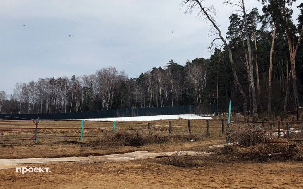 Дача № 5 в Горках-10 стоит на самом краю поселка. С одной стороны — конезавод, дорогу от которого к даче охраняет не только двойной забор, но и огромное навозное поле, перейти которое корреспондентам «Проекта» было непросто. С другой стороны — Москва-река.