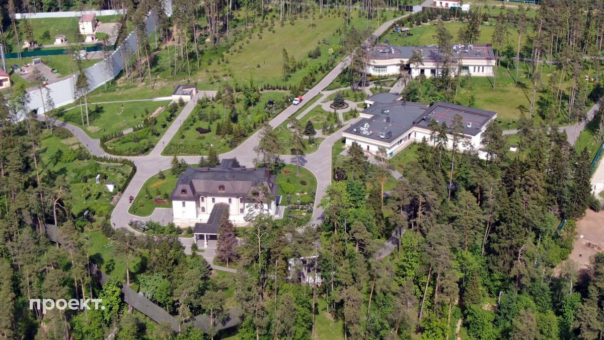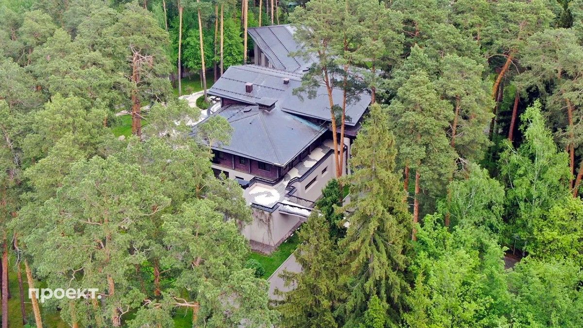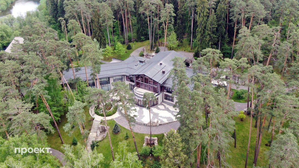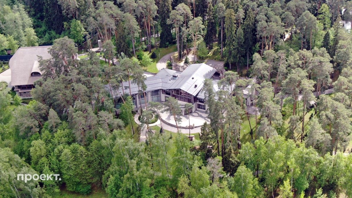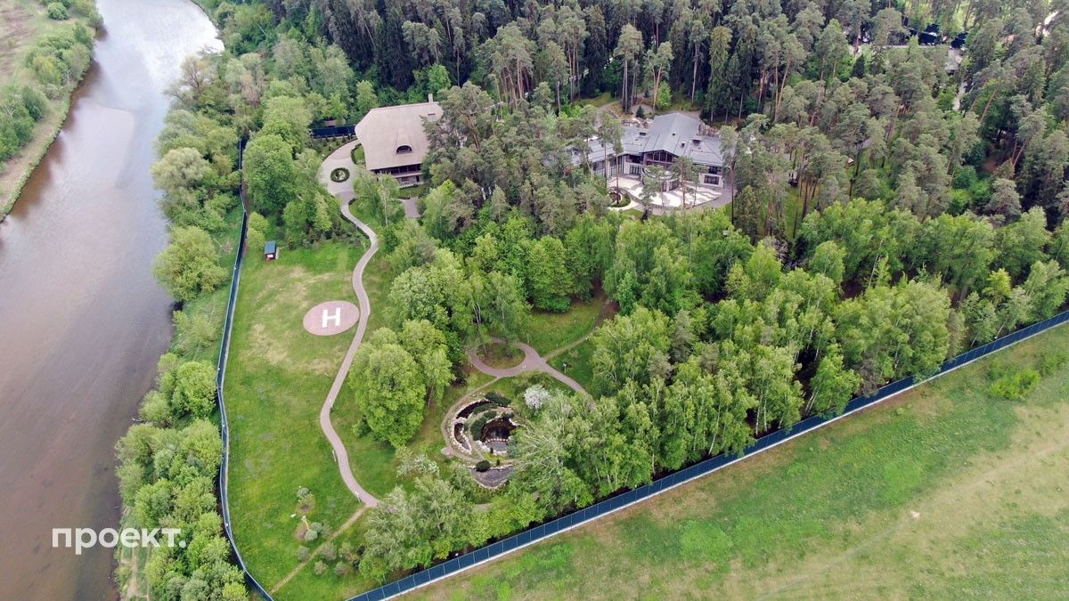 Огромный участок — почти шесть гектаров — надежно скрыт за высокими соснами, видны лишь главный дом (всего на участке три дома) и вертолетная площадка, а также элементы ландшафта: несколько небольших искусственных прудов, посаженные ели, тропинки, искусственная пещера, похожая на подземный гараж. Веранда дома украшена мозаикой, со второго этажа вглубь леса ведет небольшой мостик. Площадь большого дома — 2,2 тыс. кв. м, дома поменьше — 1,2 тыс. кв. м (третий дом не стоит на учете в Росреестре, и его площадь узнать нельзя).