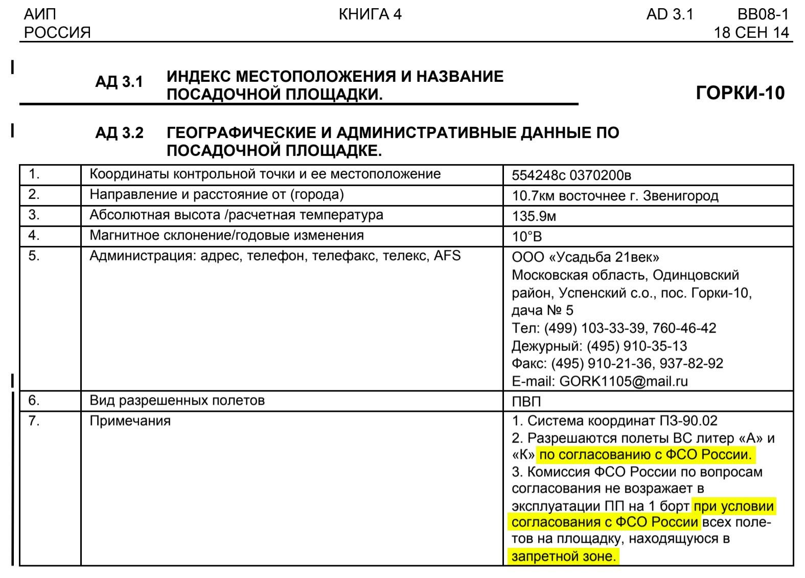 Сведения об этом содержатся в Сборнике аэронавигационной информации, составленном Федеральным агентством воздушного транспорта. Он в том числе содержит карты вертодромов и аэродромов — есть там и вертолетная площадка на даче № 5. Согласно документу, полеты над участком разрешаются только по согласованию с ФСО, сама же зона именуется «запретной».