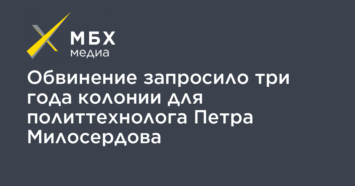 Представитель прокуратуры потребовал три года колонии общего режима и два года ограничения свободы для политтехнолога Петра Милосердова, которого обвиняют в создании экстремистского сообщества. Об этом из зала суда сообщает корреспондент «МБХ медиа».