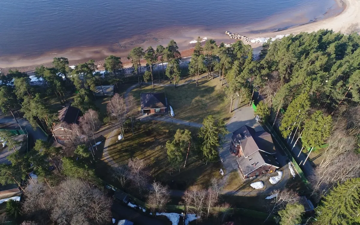 Коттедж на берегу Финского залива построен на участке размером почти в гектар. Кроме двухэтажного особнячка виден одноэтажный дом с мансардой и строение поменьше — возможно, баня. Вокруг глухой забор выше человеческого роста, камеры видеонаблюдения — гроздьями.