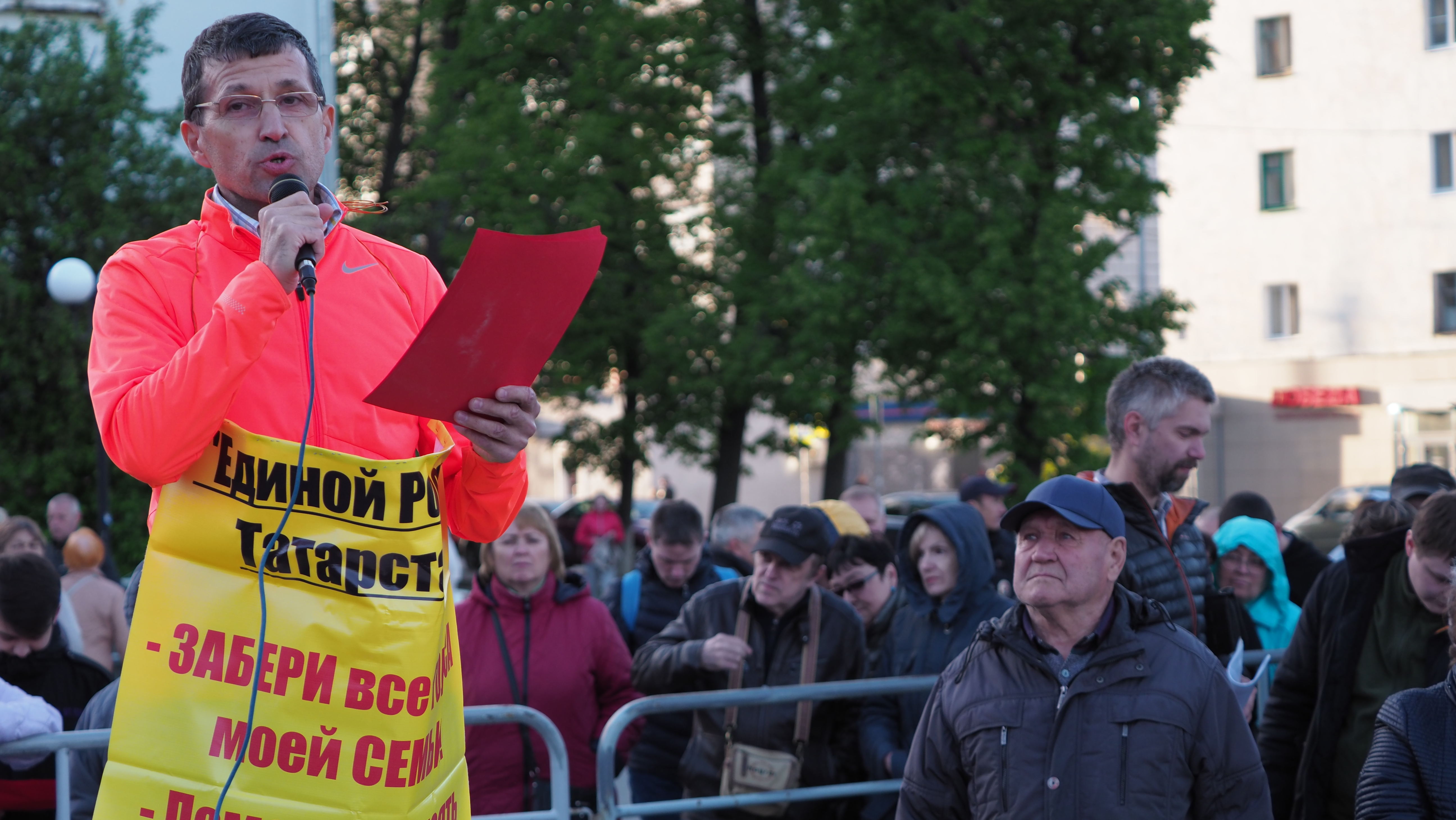 — Проблемы у нас общие. Поэтому мы должны объединиться, — обращается Ильхам к собравшимся. — Всё зависит от того, сколько нас здесь стоит. Если стоят 25 человек — это неизвестная группа лиц. Если стоит тысяча — это уже народ... Четыре раза за последние десять лет команда мэрии Казани приходит к нам на порог с целью забрать наши дома. Мы их гоним — а они опять в окно!.. Мы требуем прекратить покушение мэрии города Казани на дома наших семей и обеспечить стабильность права частной собственности.
