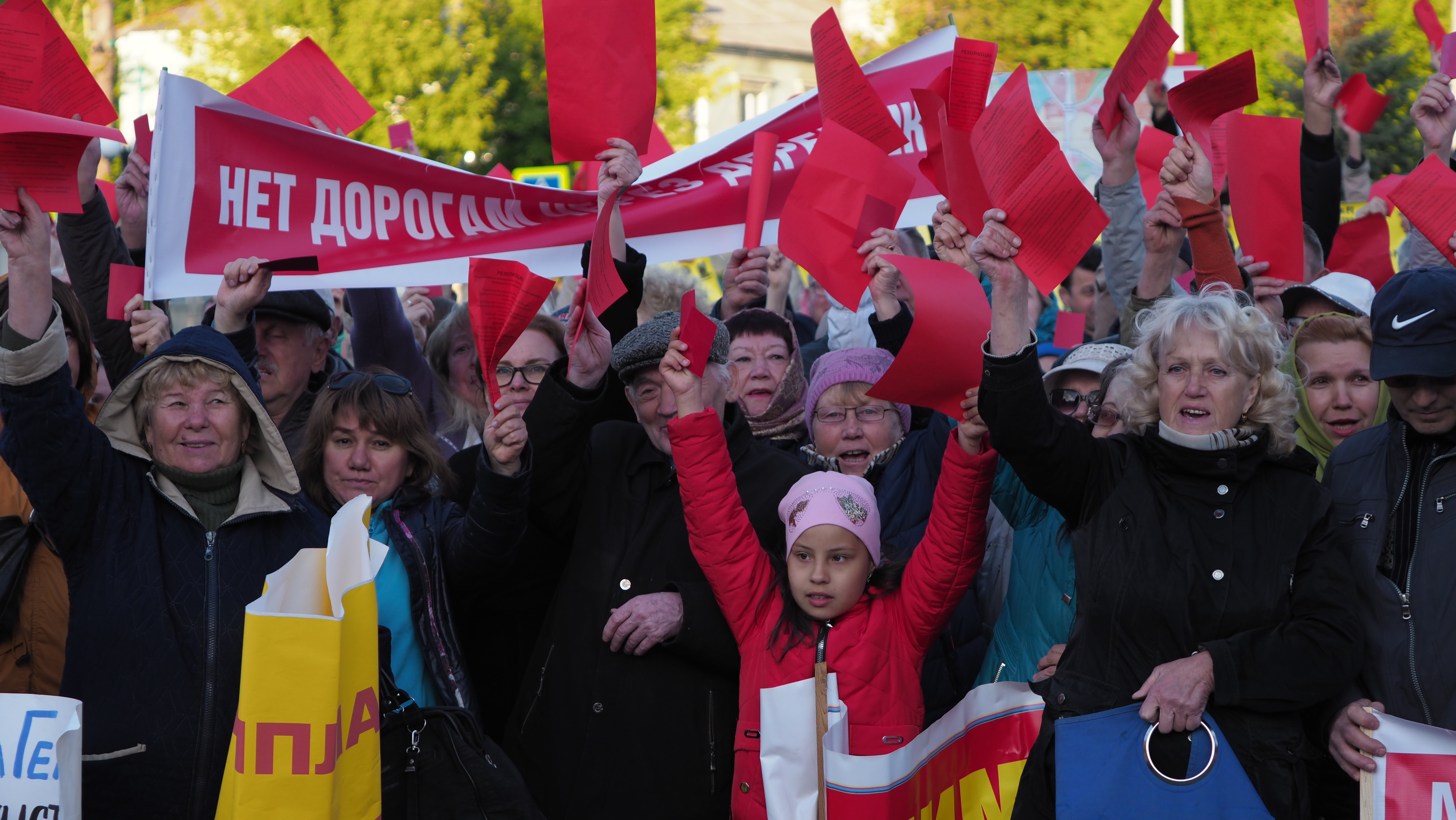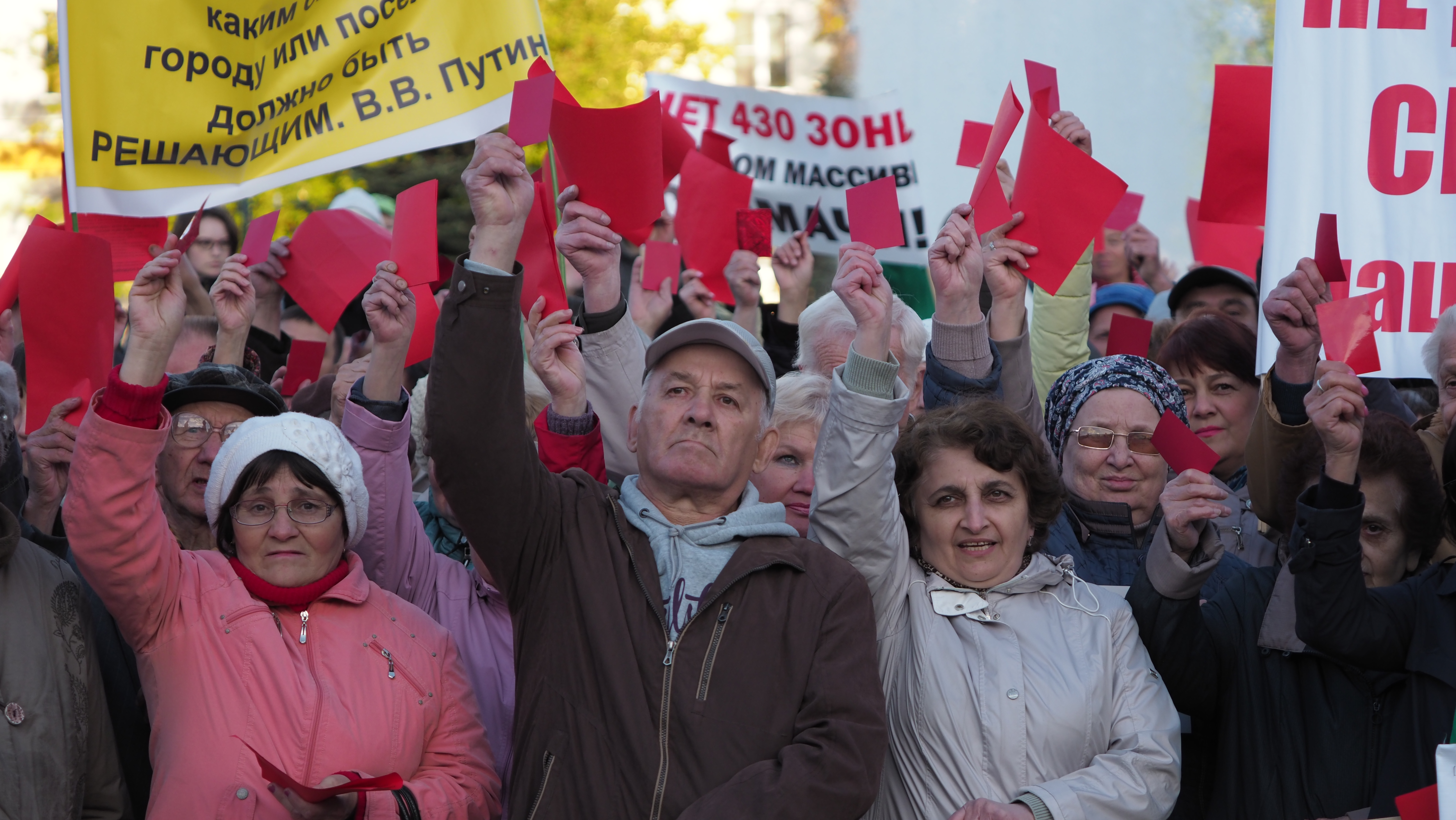 Люди вскидывают красные листы над головами. Эти листы выглядят как судейские красные карточки, предъявляемые мэру и его команде.