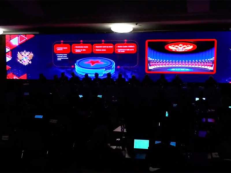 Заявку на проведение матчей мирового первенства в городе на Неве презентовал президент Федерации хоккея России (ФХР) Владислав Третьяк, которому помогали балерины. Делегатам была представлена информация о городе, а также о новой мультифункциональной ледовой арене.