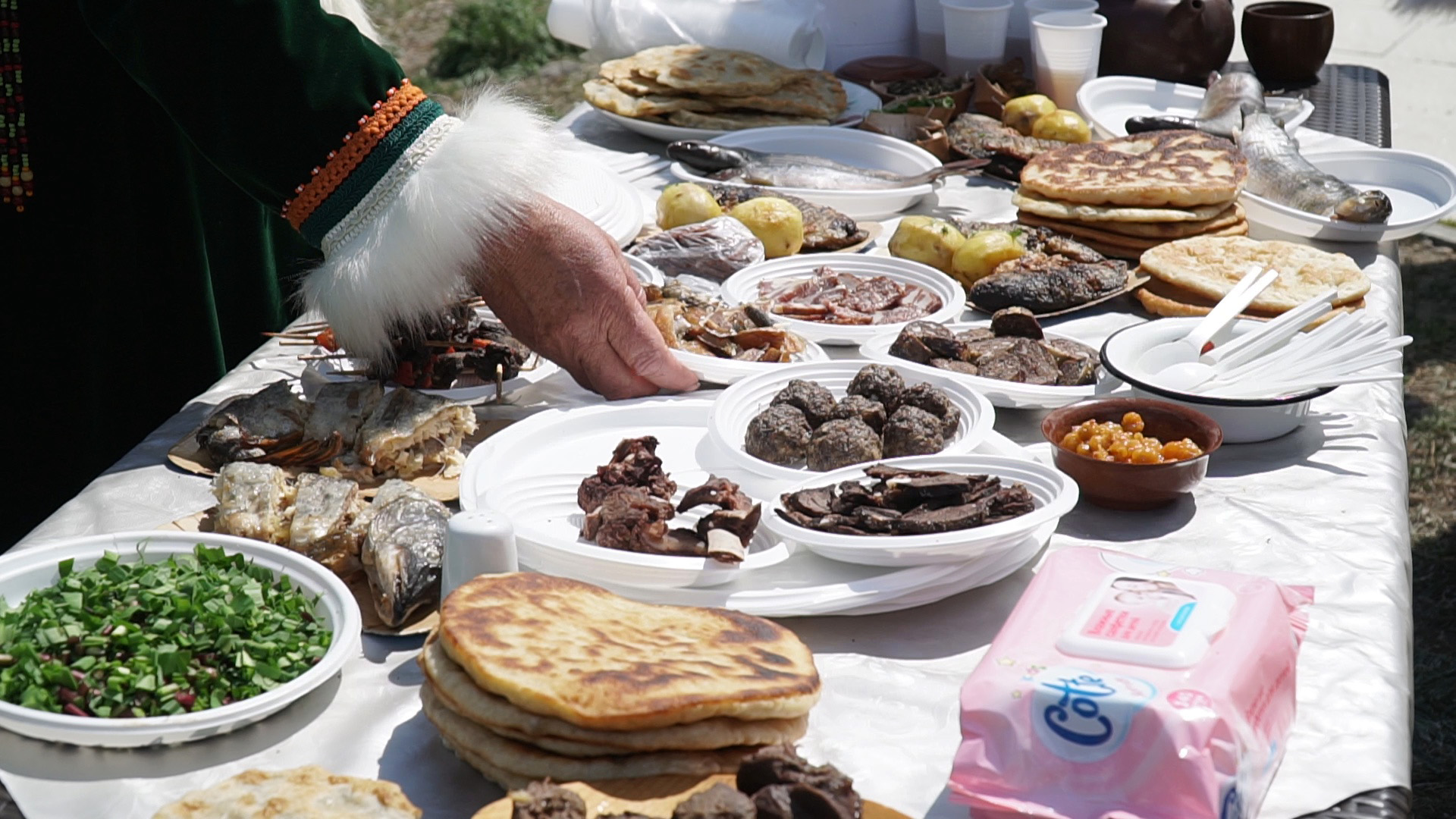 Гостей праздника угощали эвенкийской кухней. На столе рядом с чумом стояли блюда из оленя, изюбря, медведя, сига, а также черемша, морошка, пресная эвенкийская лепешка колобо. Мясо диких животных и рыбу эвенкам, которые сейчас живут в Иркутске, привозят родственники из северных районов области.