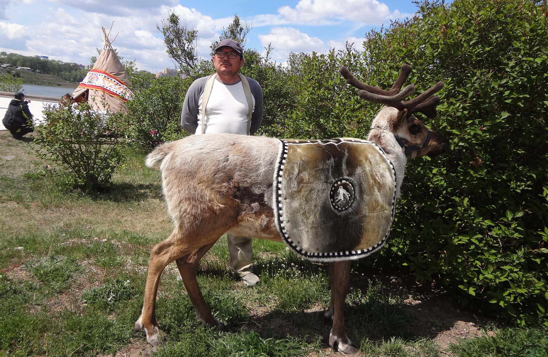 На праздник – для дополнительного колорита – привезли северного оленя. Его хозяин Александр Николаев рассказал, что это горно-таежный олень и родился он в горах Саяны.