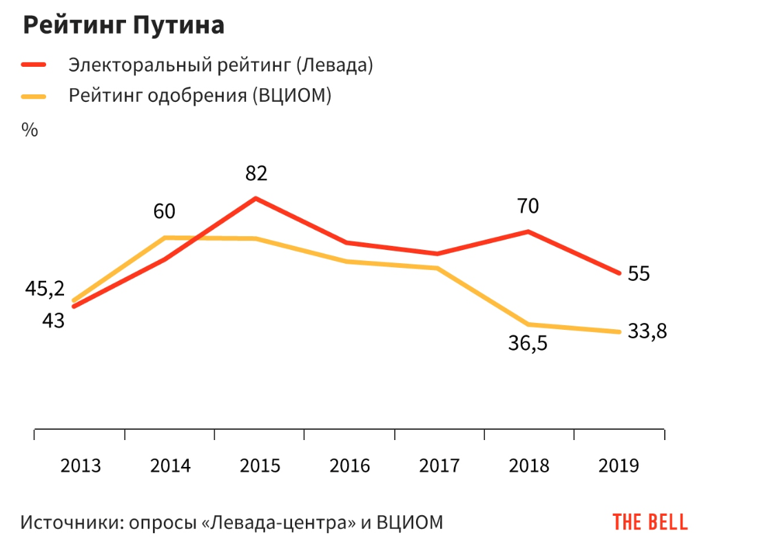 - Шоковое падение электорального рейтинга произошло из-за пенсионной реформы. После этого обвала он не только не восстановился, но и продолжил падать. В целом постепенное снижение обоих рейтингов (одобрения и желания голосовать) началось еще в 2014–2015 годах, но помимо пенсионной реформы очевидных триггеров для резкого падения не было.
