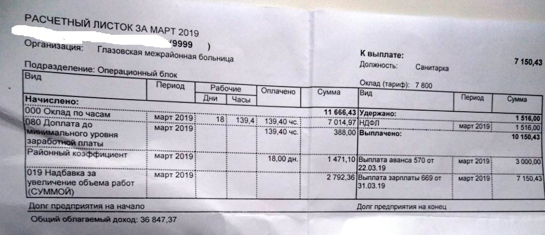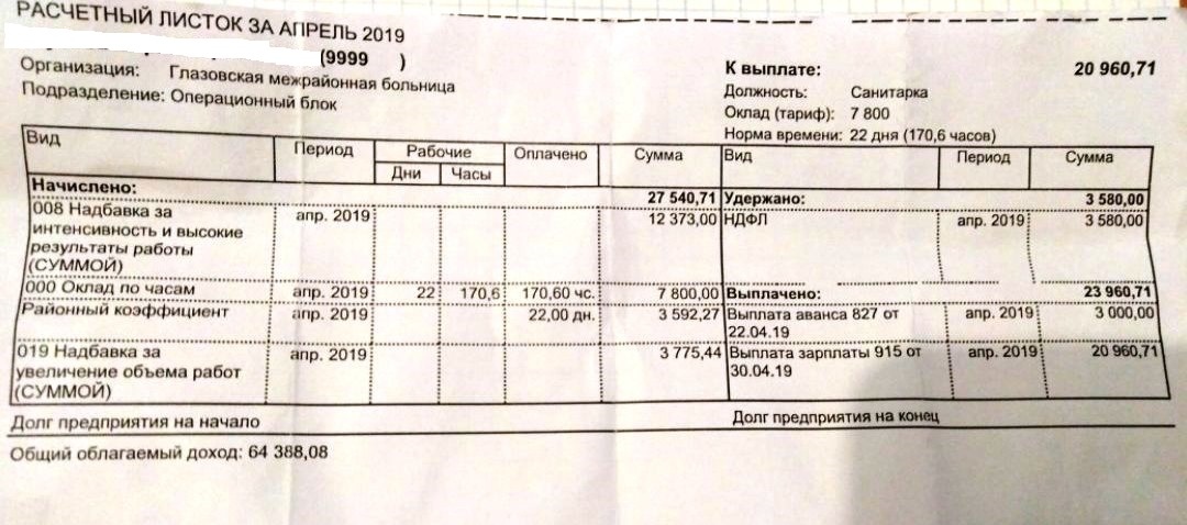 Два расчетных листа — один за март, второй за апрель. Оба принадлежат одной и той же санитарке Глазовской межрайонной больницы. За март она получила на руки 10 тысяч рублей (139,4 часа работы в месяц и 7 тысяч рублей за это), а за апрель — 24 тысячи рублей (170,6 часа работы в месяц и 7,8 тысяч рублей). Разница в зарплате объясняется только тем, что после заявки на митинг Минздрав Удмуртии пообещал повысить медперсоналу зарплату.
