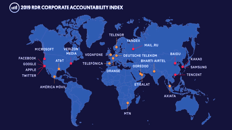 Эксперты проекта «Рейтинг цифровых прав» (Ranking Digital Rights, RDR) выпустили очередное исследование «Индекс ответственности корпораций» (Corporate Accountability Index) — теперь уже за 2019 год, который показывает уровень прозрачности деятельности крупных мировых интернет-компаний относительно прав и свобод пользователей. В соответствии с Индексом за 2019 год, исследователи пришли к выводу: самым влиятельным технологическим компаниям предстоит сделать еще очень многое для того, чтобы интернет поддерживал и защищал права каждого пользователя. RDR оценил 24 мобильные и телекоммуникационные компании, предоставляющие свои продукты и услуги более чем половине из 4,3 миллиардов пользователей Интернета по всему миру. Совокупная рыночная капитализация этих компаний составляет около 5 триллионов долларов США.
